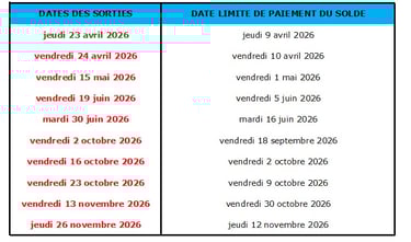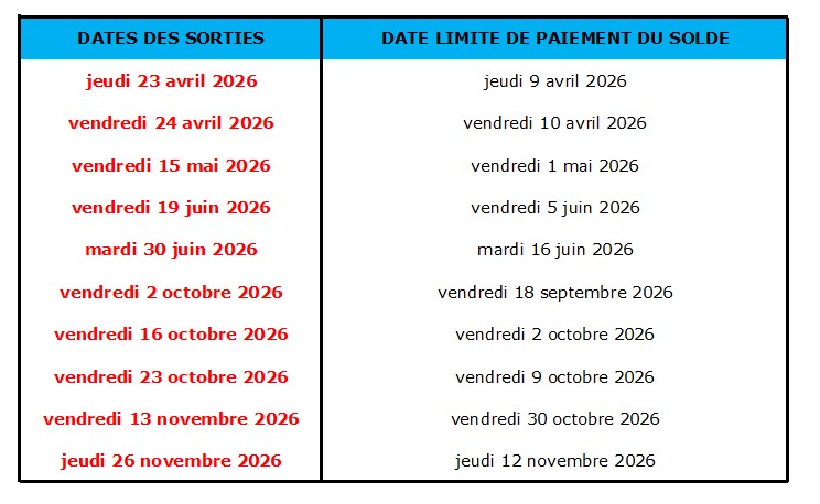 Le solde de la réservation est exigible aux dates indiquées dans le tableau suivant :