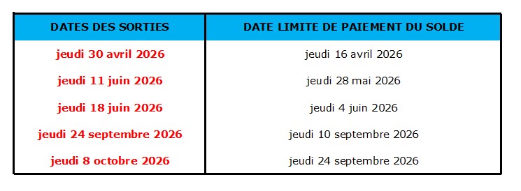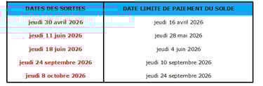 Le solde de la réservation est exigible aux dates indiquées dans le tableau suivant :