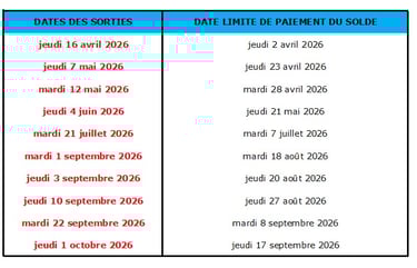 Le solde de la réservation est exigible aux dates indiquées dans le tableau suivant :