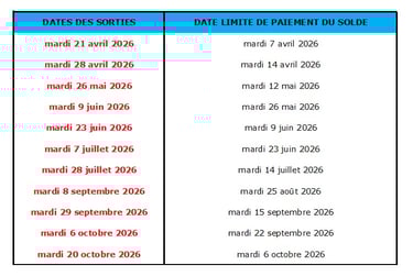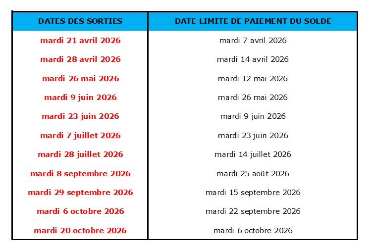 Le solde de la réservation est exigible aux dates indiquées dans le tableau suivant :