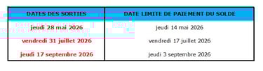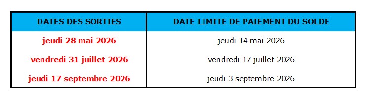 Le solde de la réservation est exigible aux dates indiquées dans le tableau suivant :