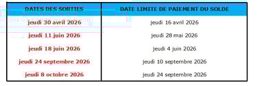 Le solde de la réservation est exigible aux dates indiquées dans le tableau suivant :
