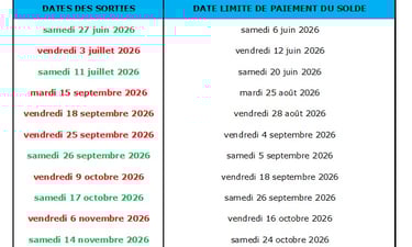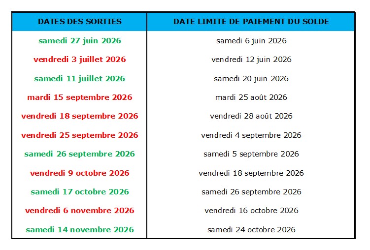 Le solde de la réservation est exigible aux dates indiquées dans le tableau suivant :