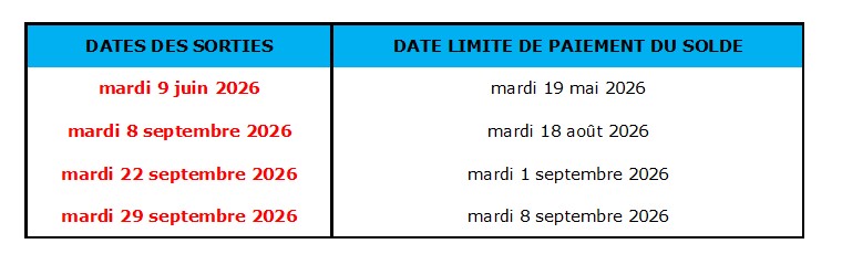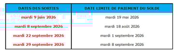 Le solde de la réservation est exigible aux dates indiquées dans le tableau suivant :