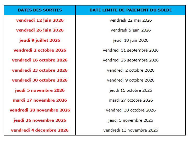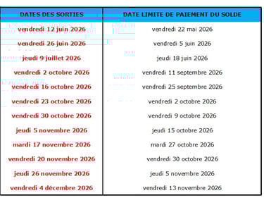 Le solde de la réservation est exigible aux dates indiquées dans le tableau suivant :